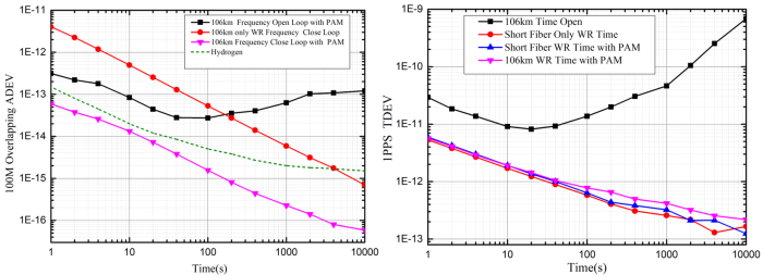 In recent years, the networked fiber-optic time-frequency transmission technology has developed rapidly. The WR (white rabbit) project is a fully deterministic Ethernet-based network that can synchronize over 1000 nodes with sub-ns time accuracy, but the frequency instabilities of the WR is 2E-11 at τ=1s due to electronic components implementation.