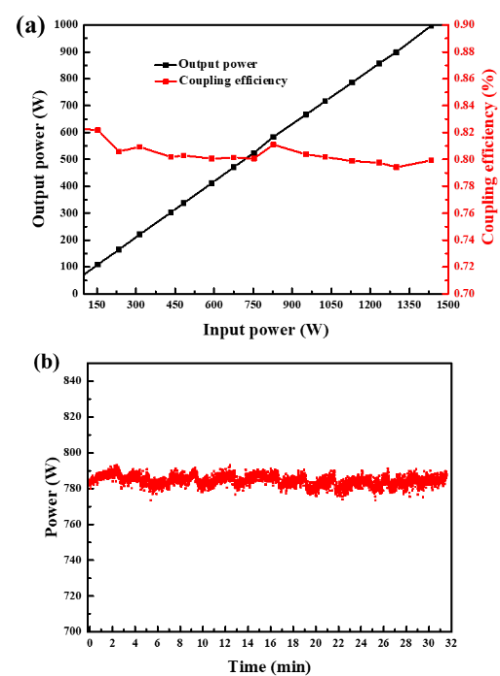 Fig.2. (a) Measured output power and coupling efficiency AR-HCF with low-refractive-index coating; (b) Temporal measurement for 1150 W incident laser power for 30 minutes without any sign of AR-HCF damage. (Image by SIOM)