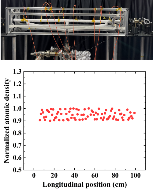 研究团队用一个长105 cm,直径2cm的真空玻璃管来产生冷原子,如图1的上半部分所示。图1的下半部分展示了在轴向上均匀分布的87Rb冷原子样品,其光学厚度大于4,温度约为25μK。首次在实验中实现了米长度尺寸的冷原子系综。与磁光阱和光学粘胶相比,这是一个极大的增长。令人值得注意的是,它的长度可以延伸到千米量级甚至更长,而且它还可以产生二维冷原子。漫反射激光冷却的真空气室原则上可以为任何形状、任何大小,而这种特性只有在漫反射激光冷却中才能实现。